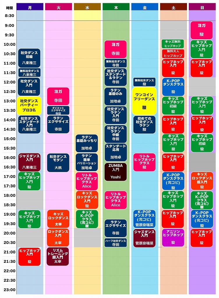 | 月曜 | 13時05分~14時00分 | フリーダンス (男性スタッフ4名 &女性スタッフ1名) | 加地/中下/ 八束/長嶋/ 寺田 | 1600円/女性 1000円/男性 |